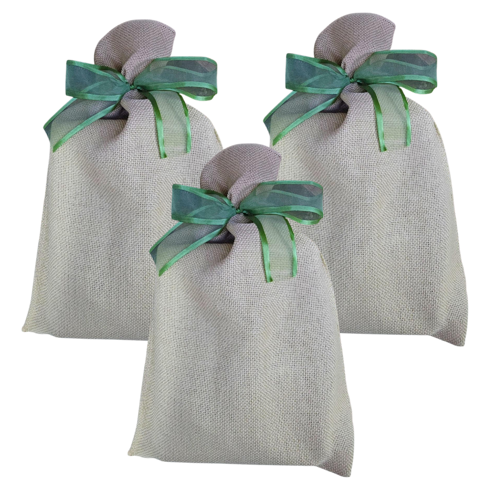 3 sacos de juta natural tamanho 30 x 44cm com laço verde