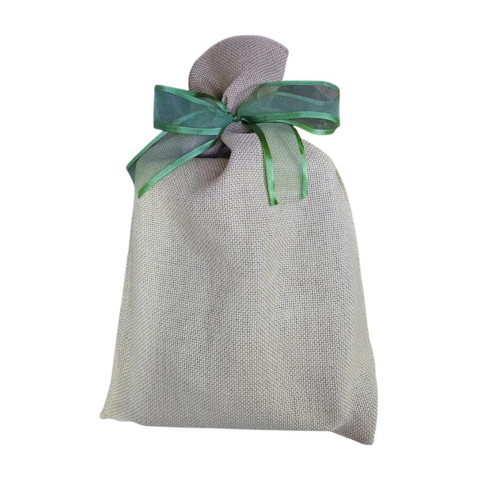 Embrulho para presente: um saco de juta natural 30 x 44cm + laço verde